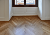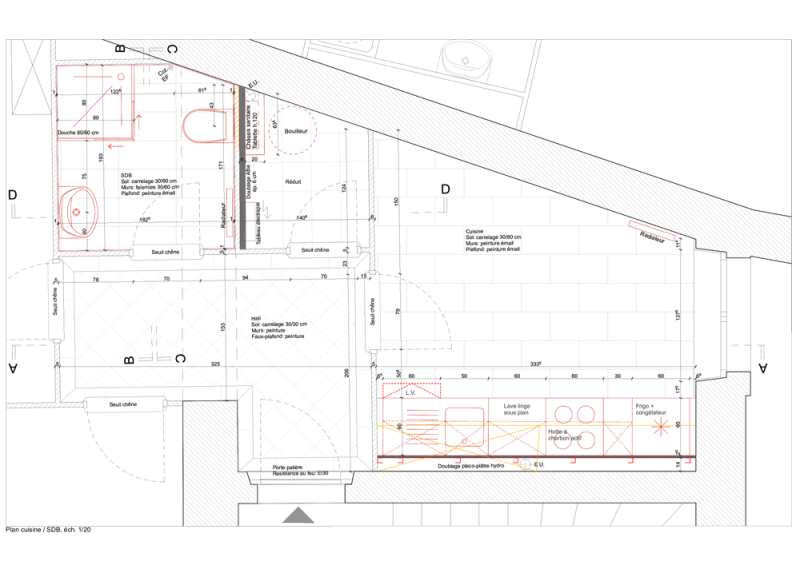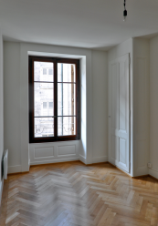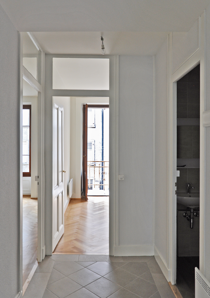 La rénovation et restauration des éléments caractéristiques de l’immeuble, tels que boiseries moulurées, porte-palière, parquet, ont été étudiés de manière à respecter le «cachet» originel de l’immeuble.