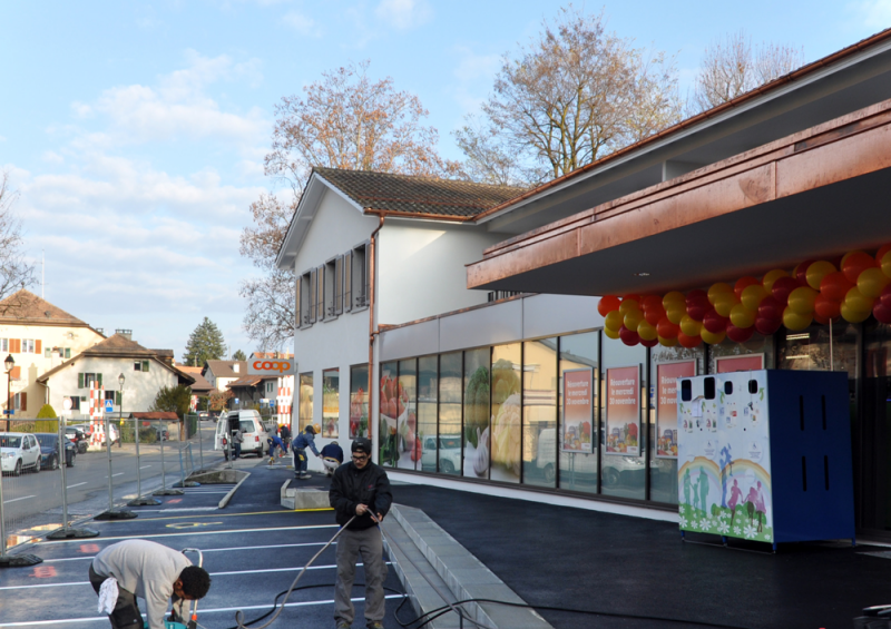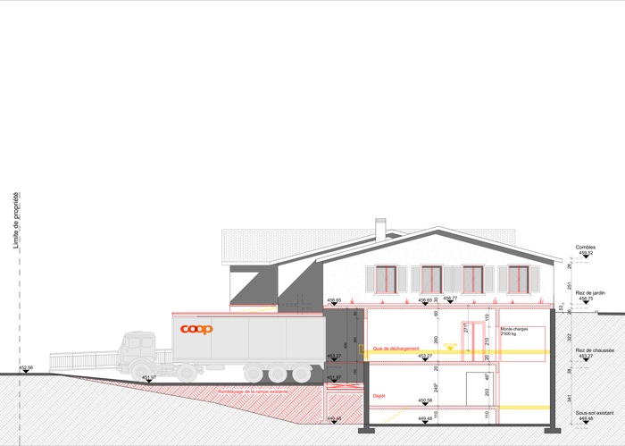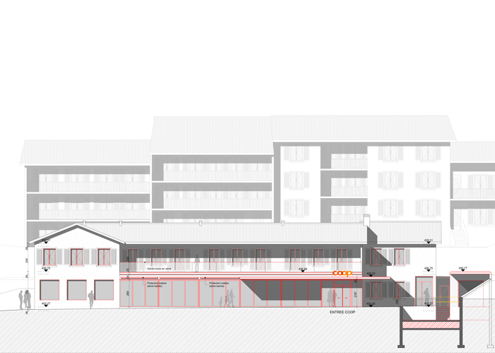 Le fonctionnement et l'aménagement du magasin Coop datant de la fin des années 1960, celui-ci ne répondait plus aux critères actuels de l'enseigne. La redéfinition de l'entrée et de la zone de livraisons principalement, a permis un gain de fonctionnalité tout en redonnant une image contemporaine au site. Une marquise en porte-à-faux souligne clairement l'entrée du magasin.