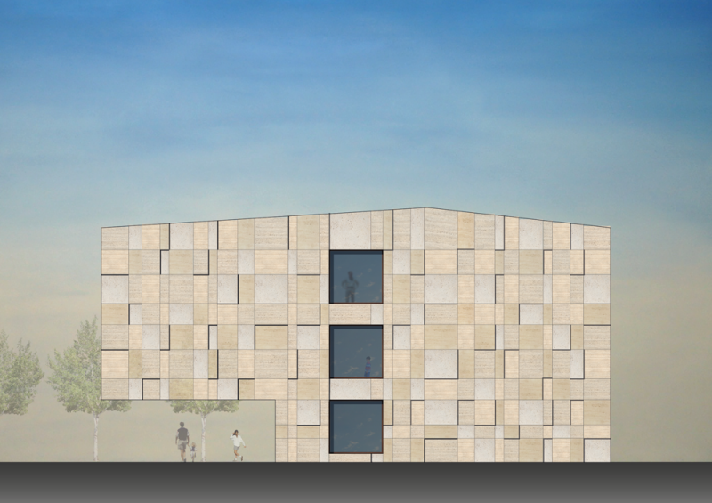 Les façades sont revêtues de travertin, qui confère à l’ensemble du bâtiment un caractère homogène, avec un donné à voir élégant et une intégration optimale dans le site. La lumière viendra animer l’ensemble des parements en pierre, qui présentent des épaisseurs et nuances variées, laissant ainsi entrevoir un aspect différent tout au long de la journée.