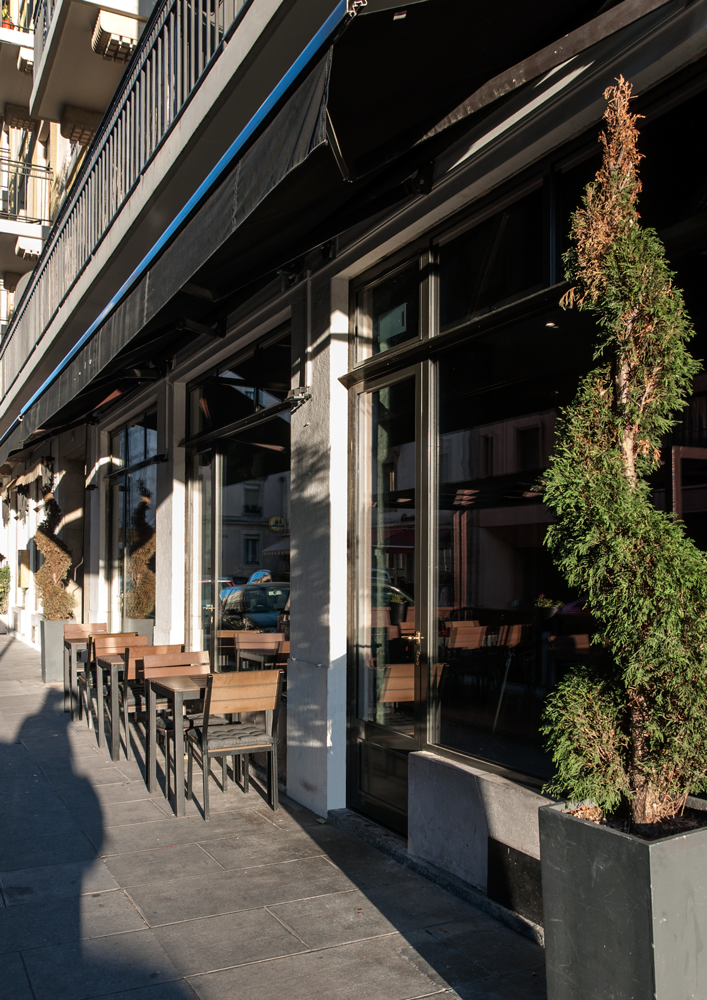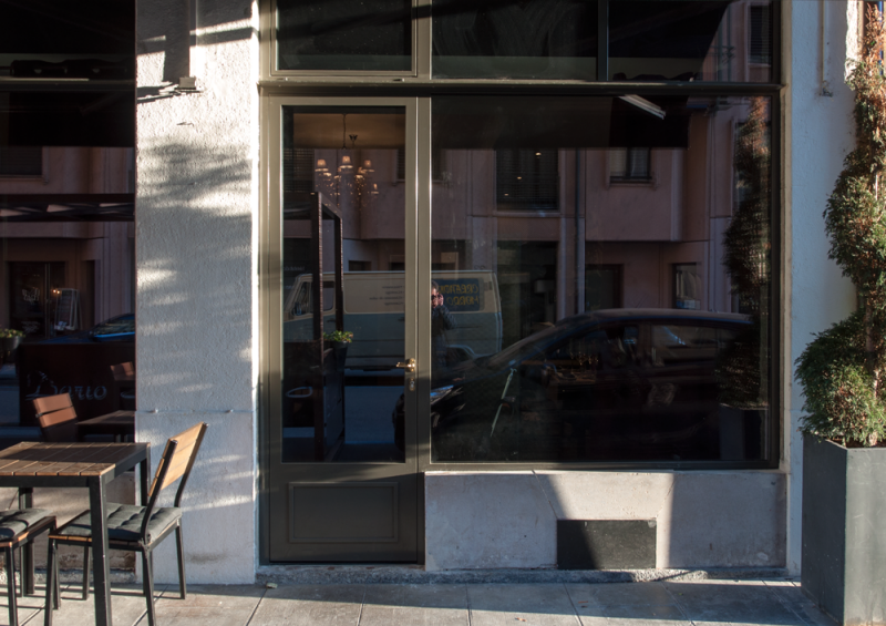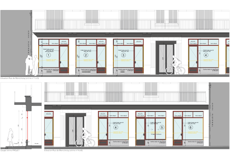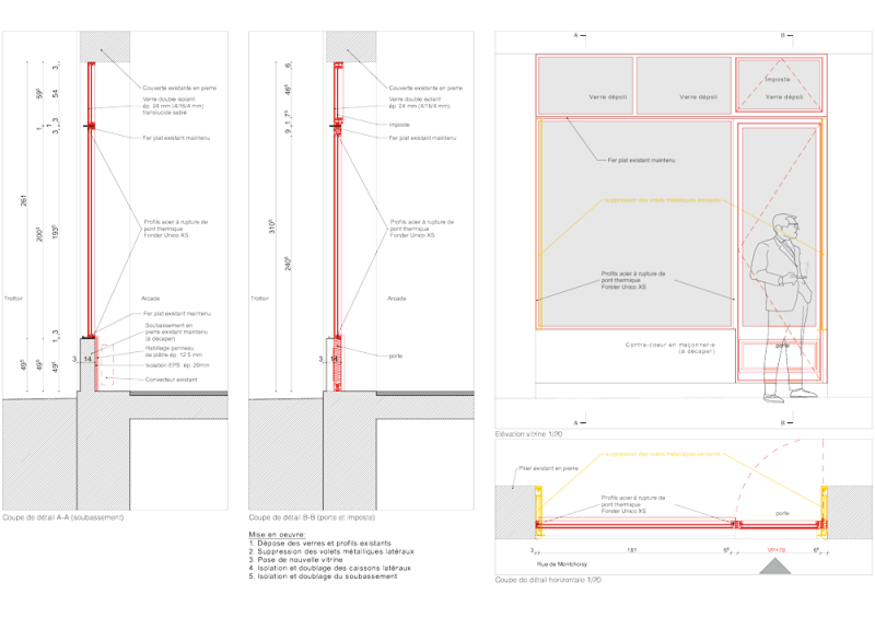 La mise en conformité (thermique et voie de secours) des vitrines dans cet ensemble protégé a été amorcée dès le début du projet avec les services de l'Etat. Ce dialogue a permis de remplacer entièrement les vitrines d'époque, tout en gardant les caractéristiques d'origine: proportions, finesse des cadres, fers plats, poignées à l'ancienne.