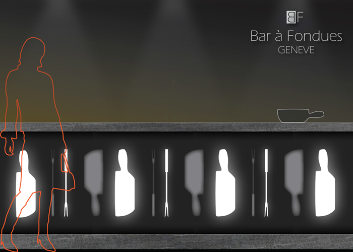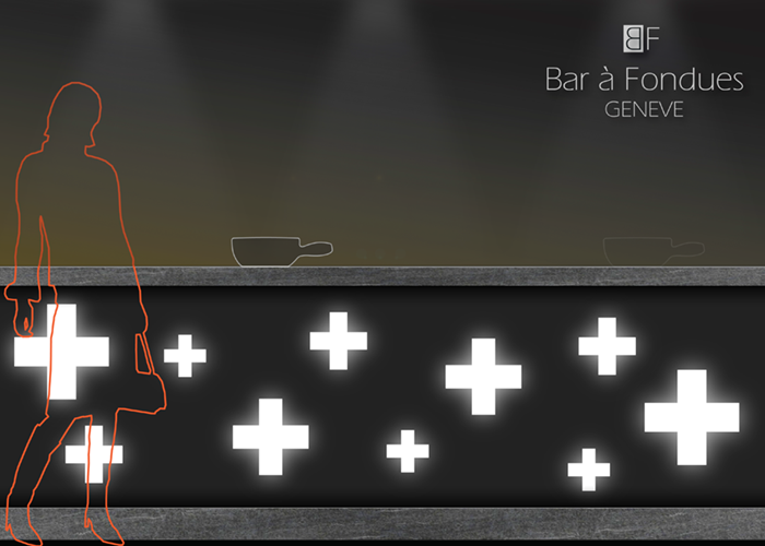 Le souhait du MO d'orienter son service vers les mets au fromage, nous a poussé à ré-interpréter les images classiques véhiculées par cette spécialité suisse (chalet de montagne, vaches, feu de cheminée, etc. )